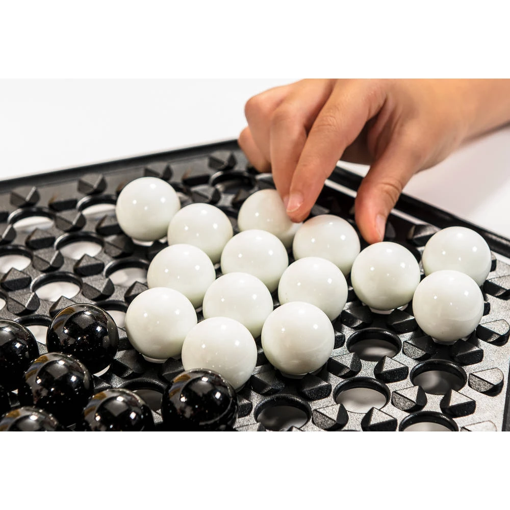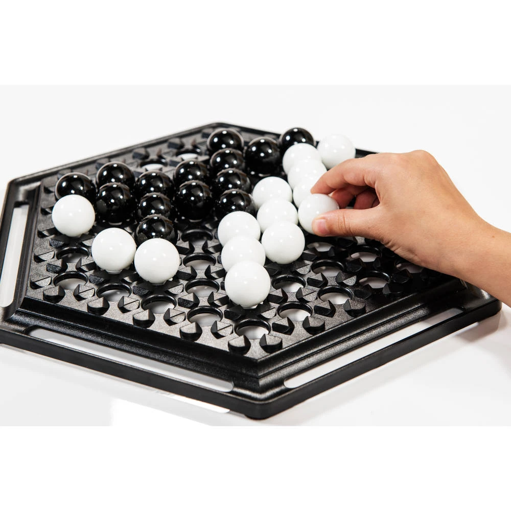 - Je speelt met een zeshoekig bord met zwarte en witte knikkers.