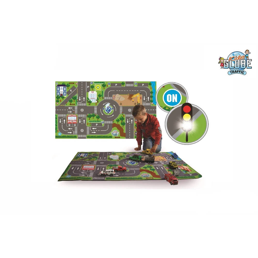Kinderen kunnen zich prima vermaken op dit Kids Globe verkeerskleed met LED-verkeerslichten. Het kleed is 72 x 120 cm groot.