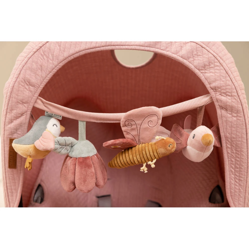 Aan de Little Dutch Flowers & Butterflies wagenspanner in vrolijk bloemen- en vlinderthema hangen vier speeltjes voor jouw baby om naar te kijken en vast te pakken.