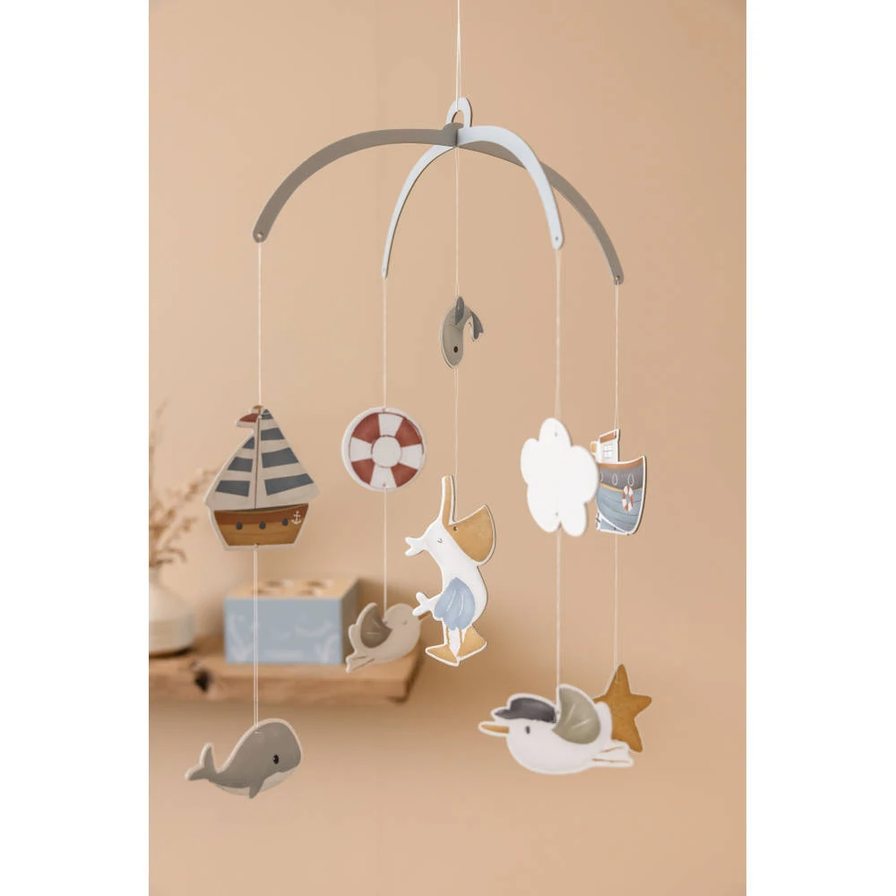 - Aan de mobiel hangen tien kartonnen figuurtjes in Sailors Bay-thema om te ontdekken en te bewonderen.