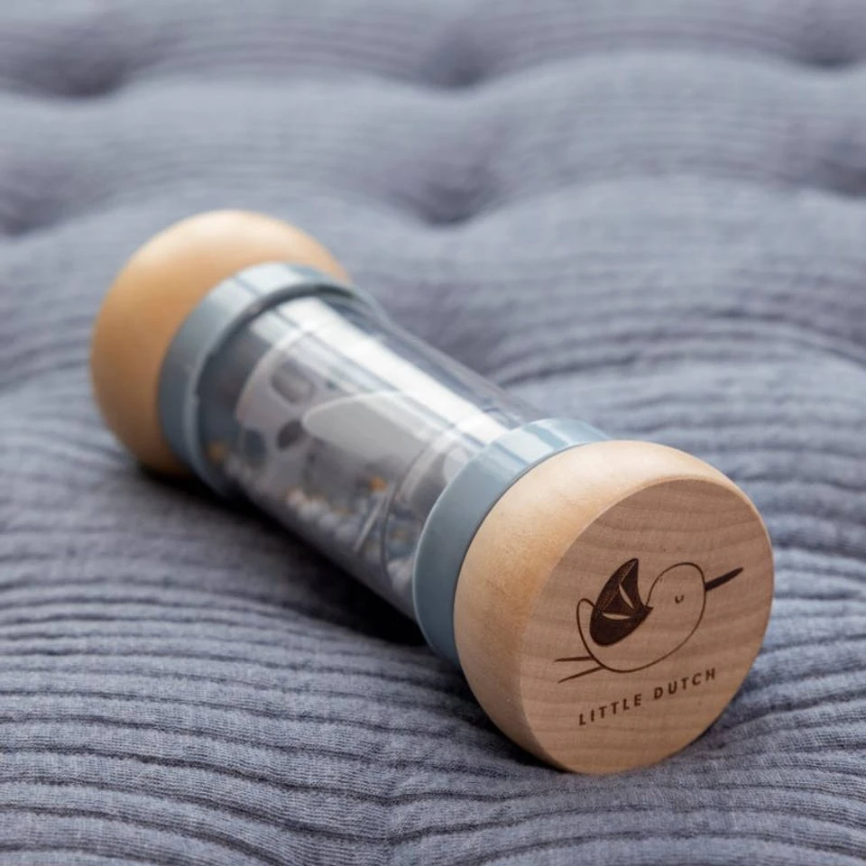 De gekleurde balletjes in deze blauwe Sailors Bay regenrammelaar van Little Dutch bootsen het rustgevende geluid van regen na.