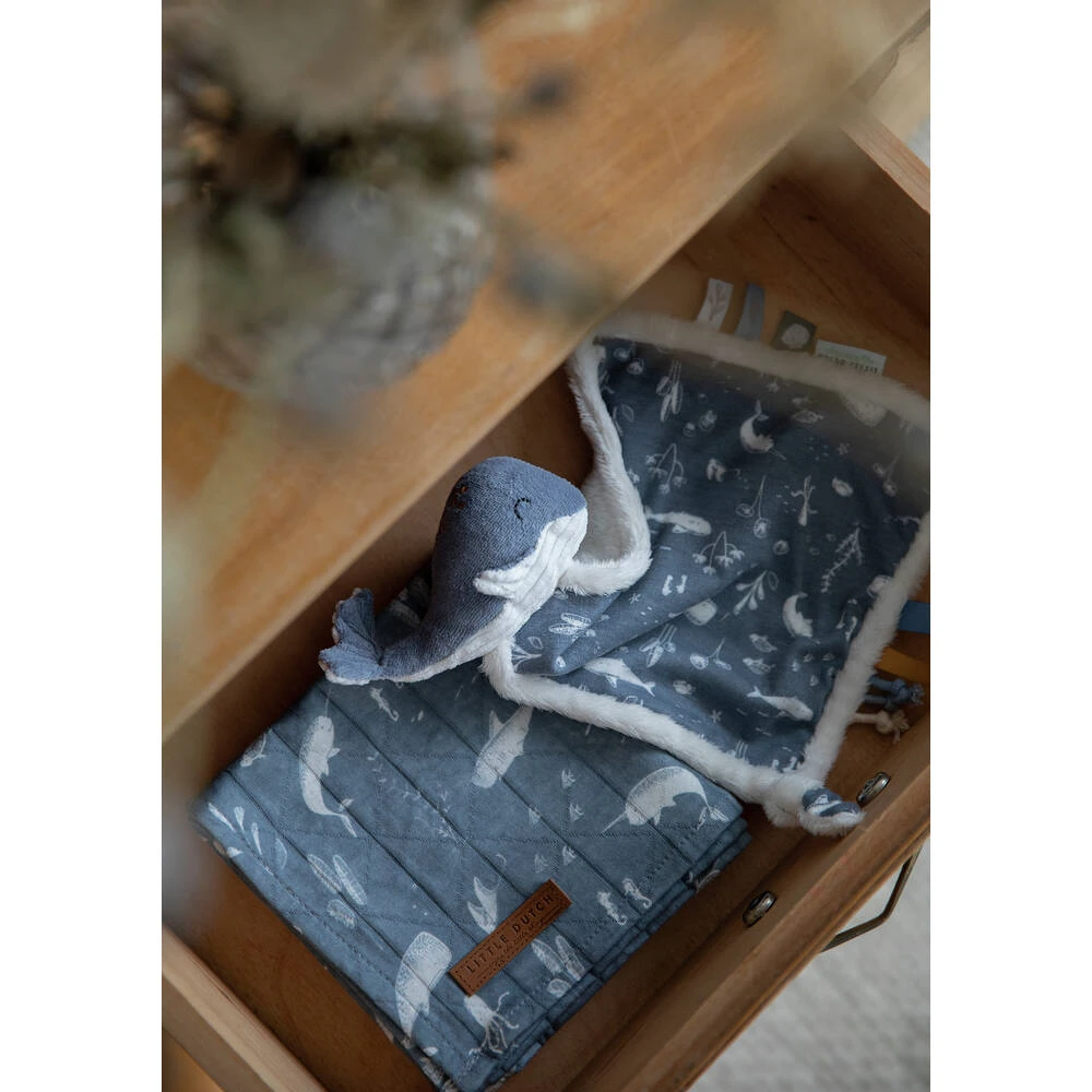 Deze blauwe, zachte knuffeldoek van Little Dutch heeft een leuk Ocean thema. Aan het doekje zit een vrolijke en knuffelbare walvis.
