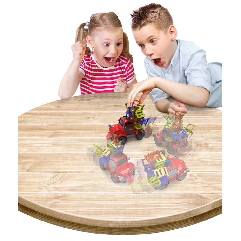 Elke speler pakt 6 stoelen van één kleur. Zet de schakelaar op ‘aan’ en het spel begint. Zie hoe Pete rondjes begint te rijden. Weet jij je stoelen tactisch en effectief te stapelen?