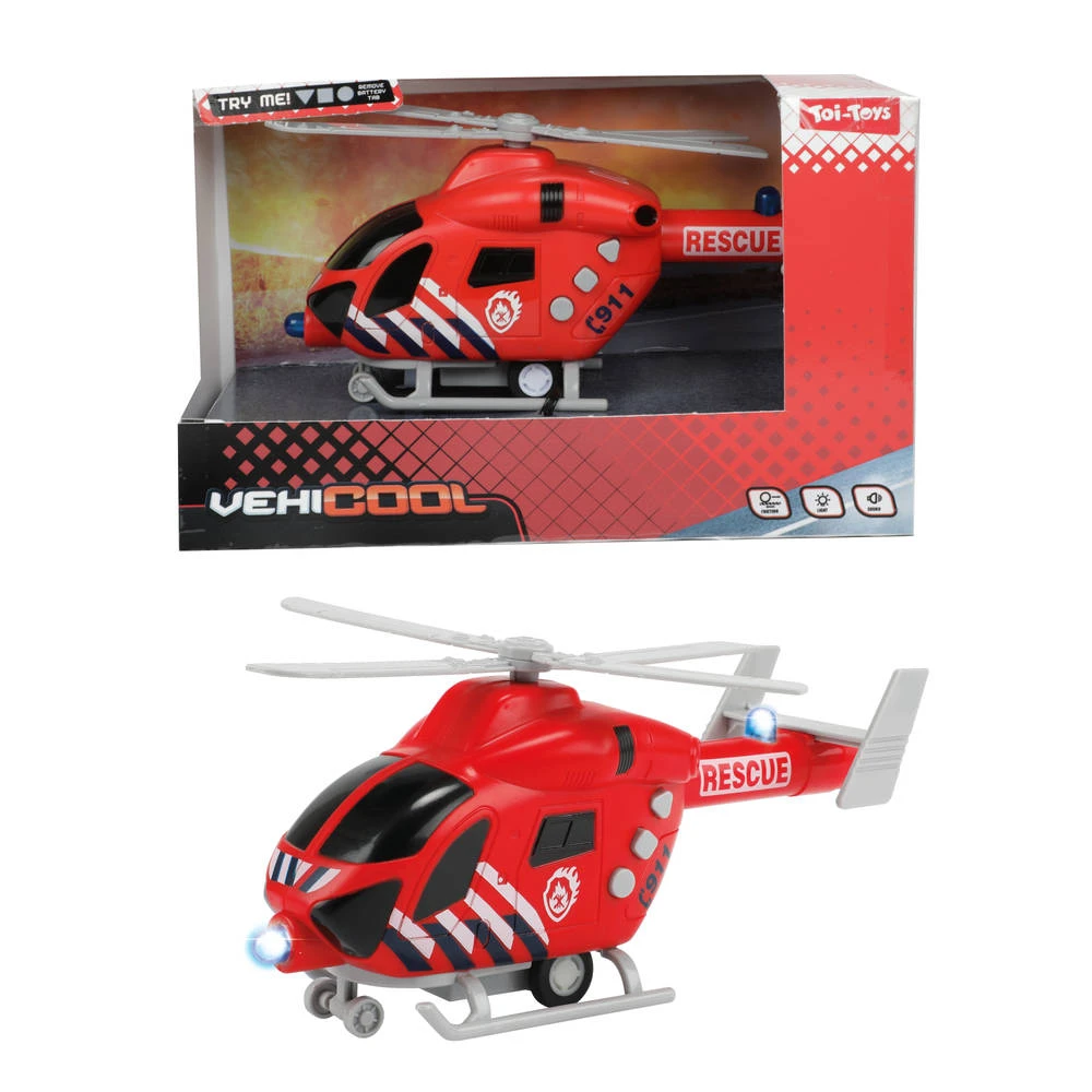 Met de Vehicool brandweerhelikopter ben je heel snel bij de brand. De helikopter heeft zwaailichten die geluid en licht maken.