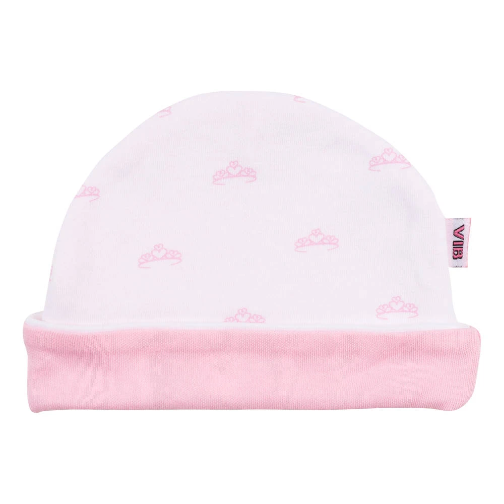 Met deze wit-roze VIB all over print ronde muts tiara blijft het hoofje van je baby altijd warm. Op de omslag van het mutsje is een tiara geborduurd.