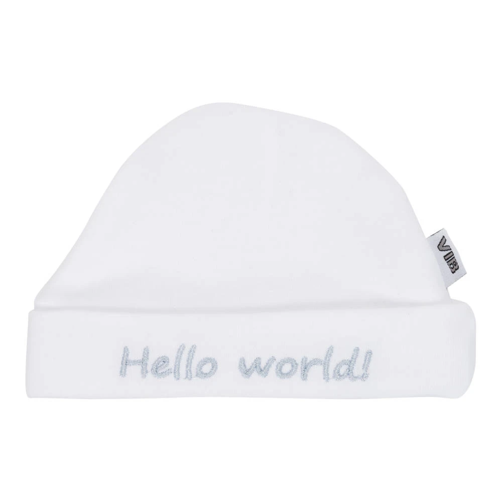 Mooie, witte VIB hello world ronde muts die het hoofdje van je kind altijd warm houdt. De woorden ‘hello world’, staan erop geborduurd.