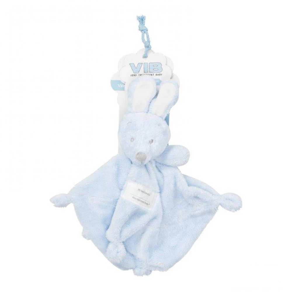 Dit blauwe VIB knuffeldoekje met konijnenhoofd is lekker zacht en gemaakt van 100% polyester. Op het doekje staat de tekst ‘Very Important Baby’.