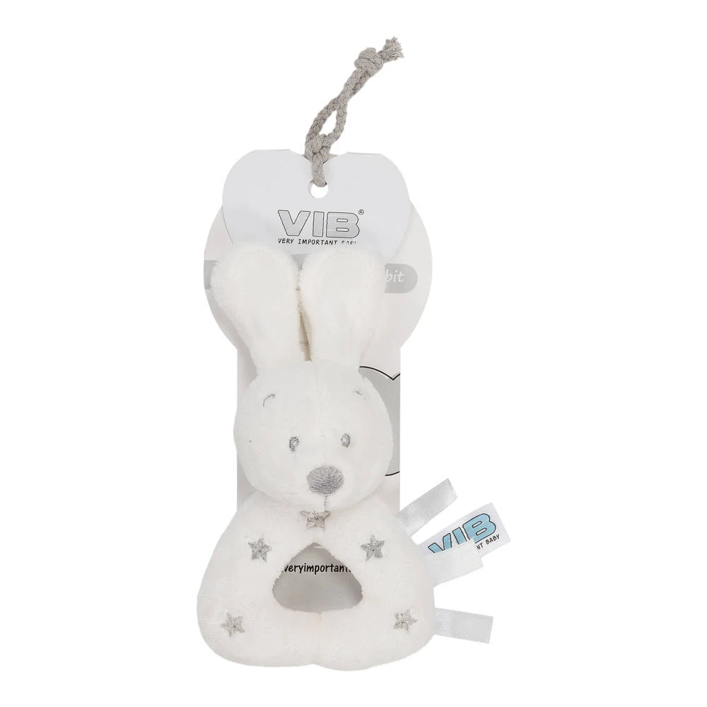 - Spelen en knuffelen met deze witte VIB konijn rammelaar.