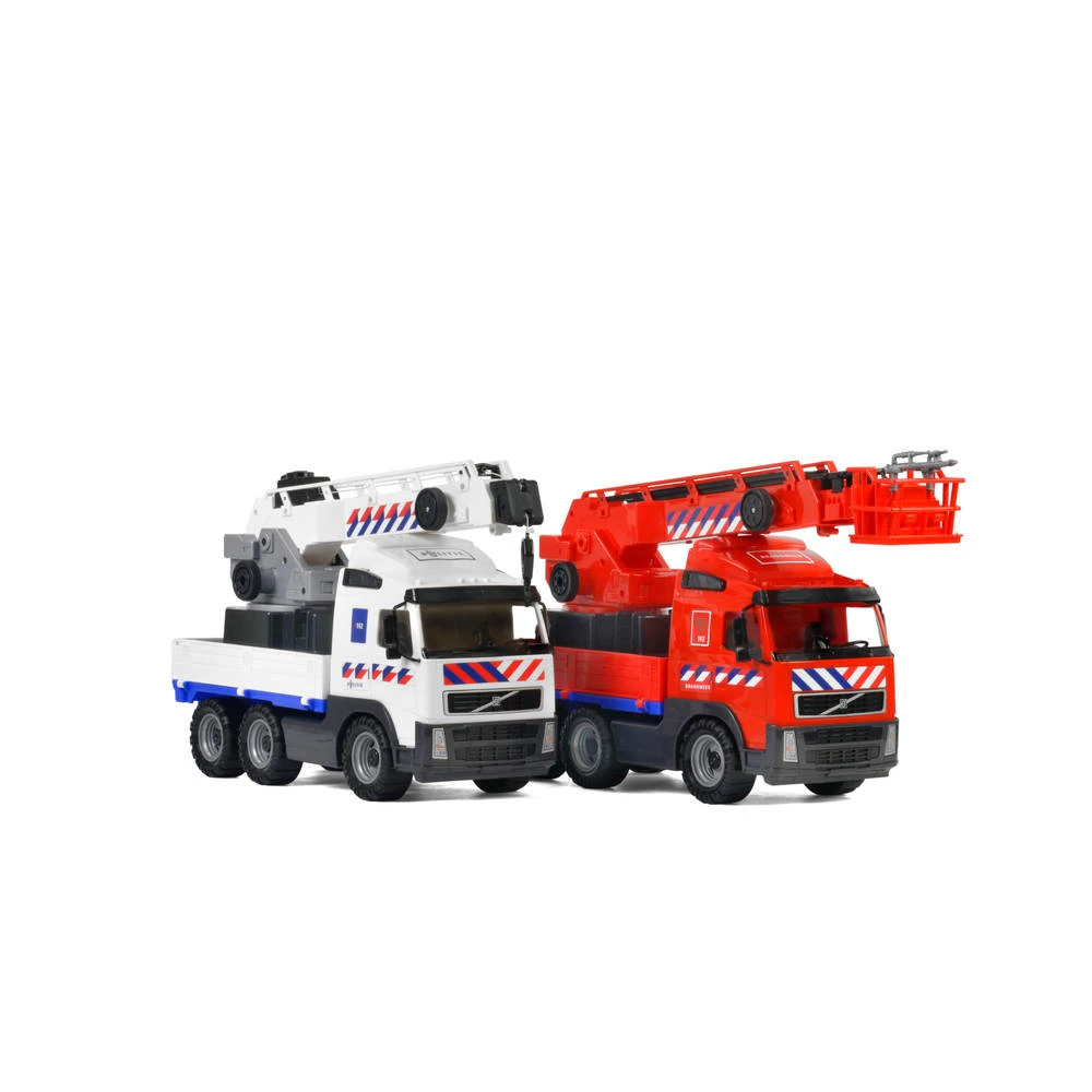 Met de stoere Volvo PowerTruck brandweerwagen blus je gemakkelijk brandjes in hoge gebouwen. Op de vrachtwagen zit een kraan met korf. Je kunt deze kraan uitschuiven, draaien en verhogen. Hierdoor kun je je gemakkelijk een echte brandsituatie inbeelden. Onder de wagen zitten zes wielen die zorgen voor extra stabiliteit. Doordat de kraanwagen van sterke kunststof is gemaakt, is hij van topkwaliteit.