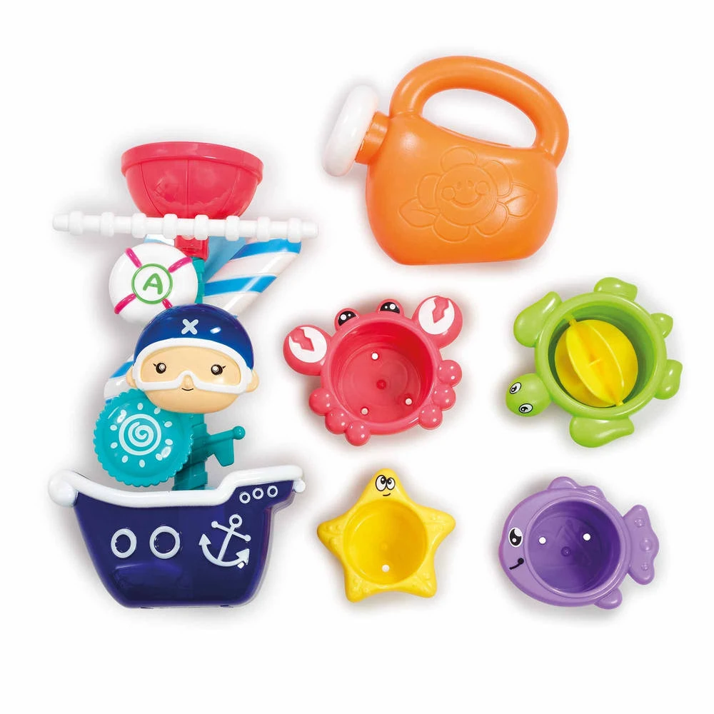 Ahoy daar! In bad gaan wordt echt een feestje met deze leuke Droplets piraten badset. Gebruik de gieter en de bekers om water in het kraaiennest van het schip te gieten, zie de wielen en de piraat draaien en wervelen en kijk dan hoe het water uit de bodem van de boot spettert! De schattige bekers met zeedieren in felle kleuren helpen met vorm- en kleurherkenning en het ronddraaiende wiel in de zeeschildpad zorgt voor volop speelplezier in bad. Deze speelset is gemaakt van stevig, duurzaam rubber en plastic en is perfect voor kleine handen.