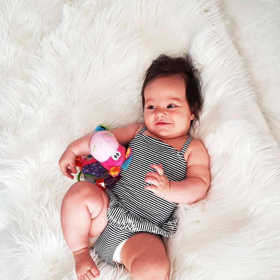 De pootjes van de activiteitenrammelaar zijn voorzien van knisperende geluiden en een spiegeltje om het zelfbewustzijn te bevorderen.