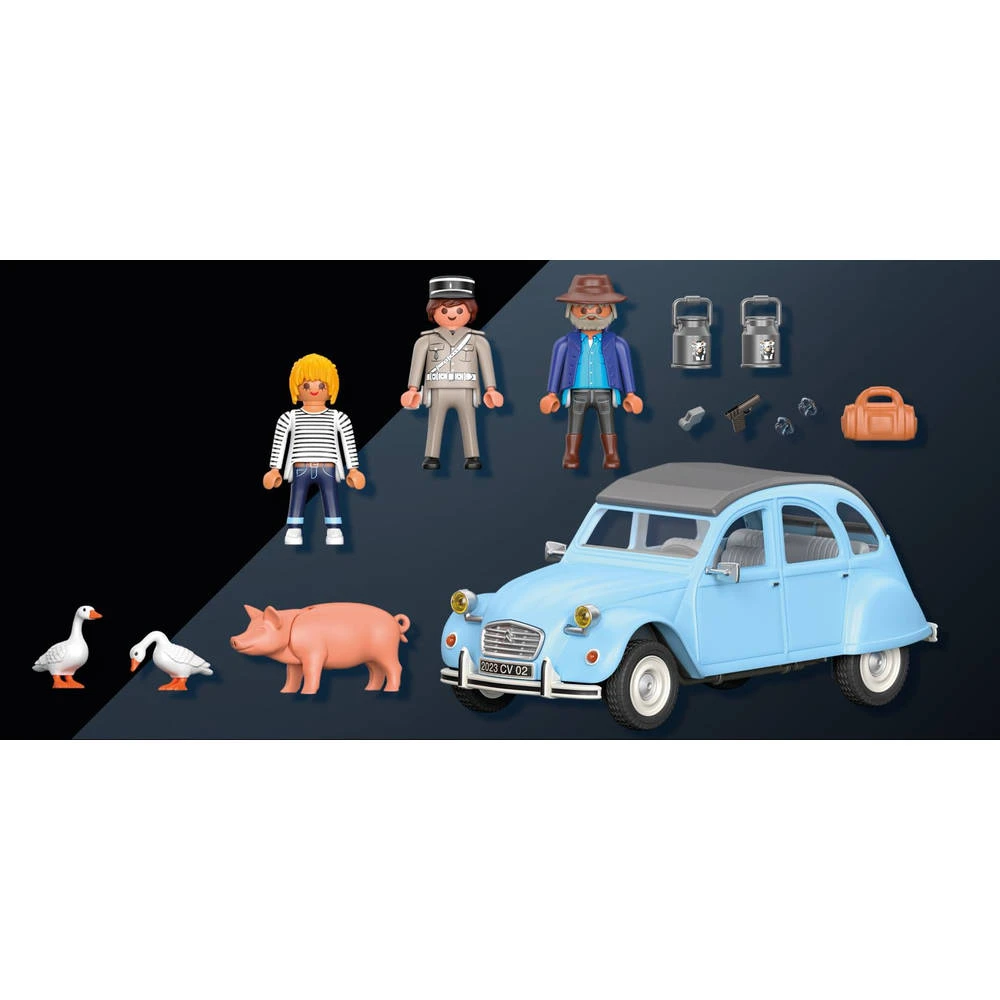 - De set bevat een bevat een Citroën 2CV van Playmobil, 3 Playmobil-figuren, een varken, twee ganzen, twee melkkannen, koplampen en nog veel meer leuke extra’s.