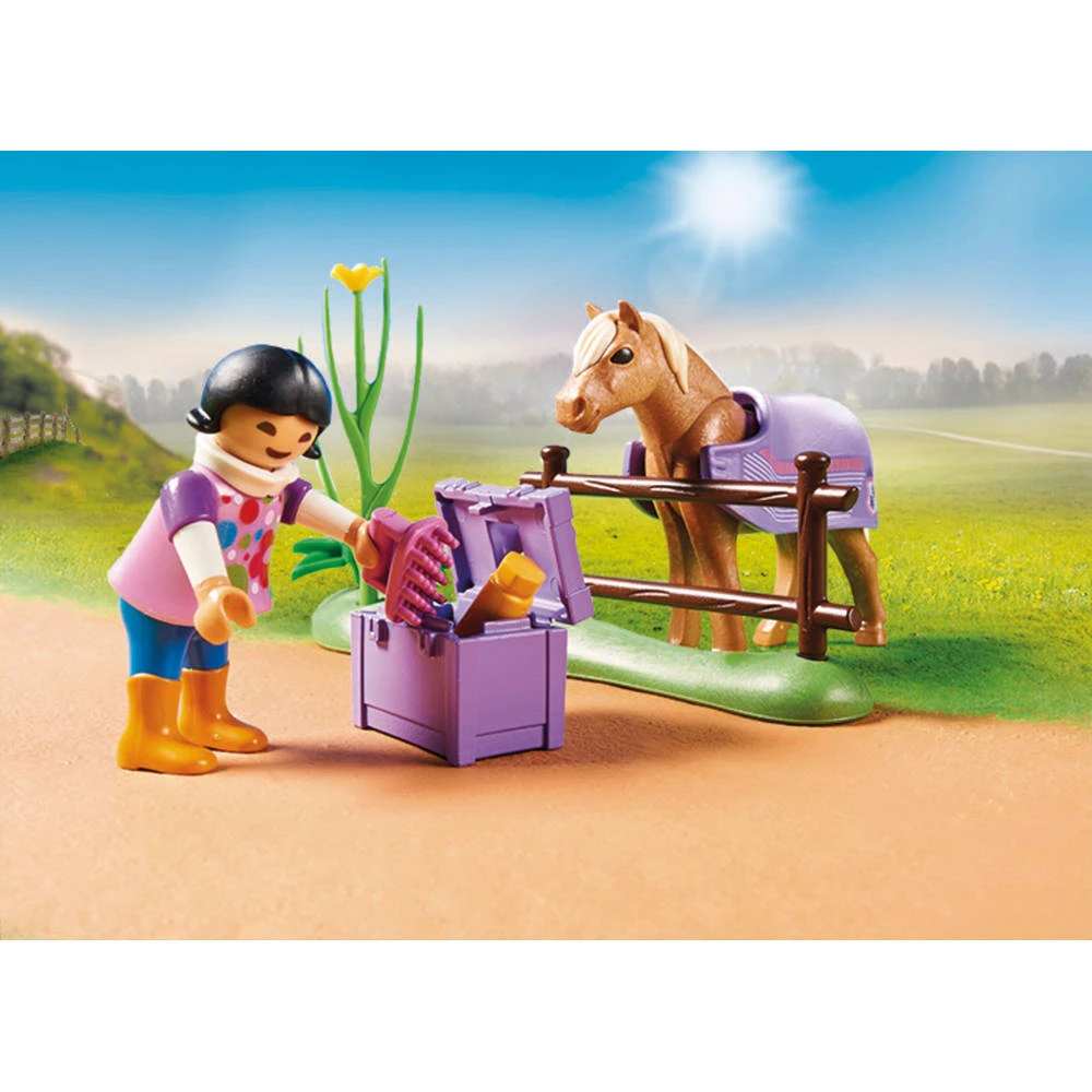 Met de verzamelpony IJslander van Playmobil Country beleef je volop avontuur. Het meisje en haar geliefde IJslandse pony zijn onafscheidelijk. De paardenliefhebster zorgt elke dag voor haar pony, brengt hem vers hooi, verzorgt de vacht en hoeven. De speelset bevat een meisjesfiguur, een IJslandse pony, hooi, een emmer, worteltjes, een hekelement en andere speelse details.
