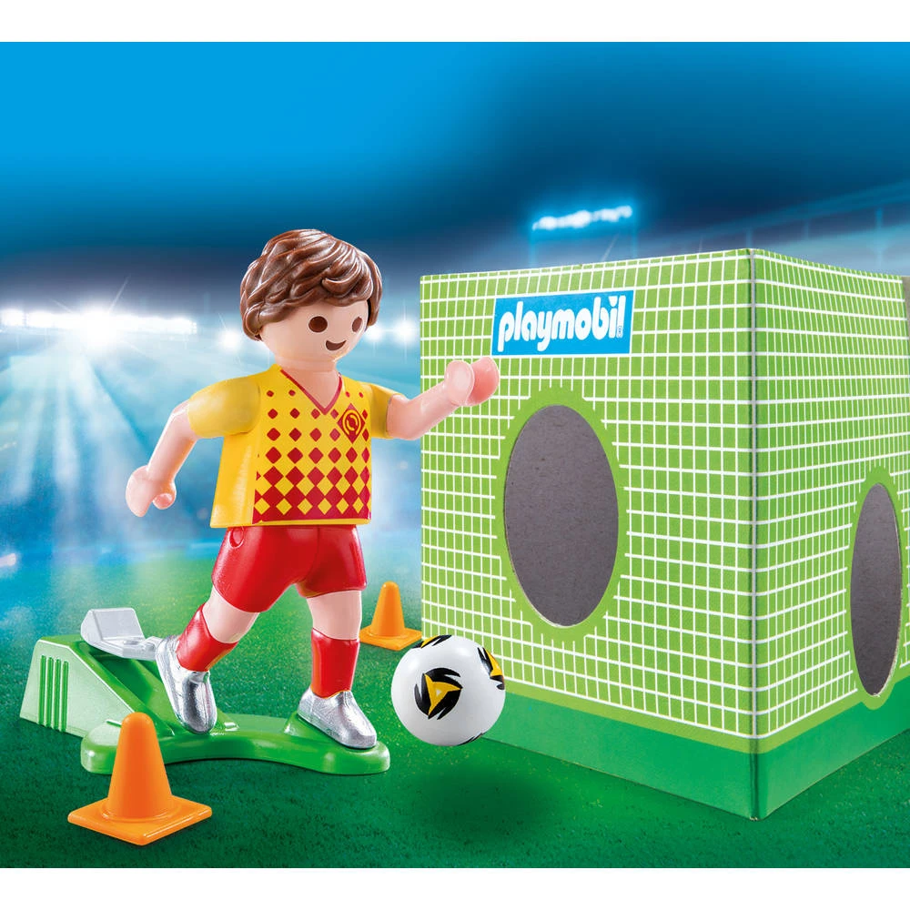 Word jij de nieuwe topscorer van het populairste voetbalteam met deze Playmobil voetballer met doel set? Je kunt in ieder geval jouw schoten op het doel oefenen met deze actieve speelset. De set bevat een Playmobil figuur, voetbaldoel, pionnen en bal om mee te trainen.