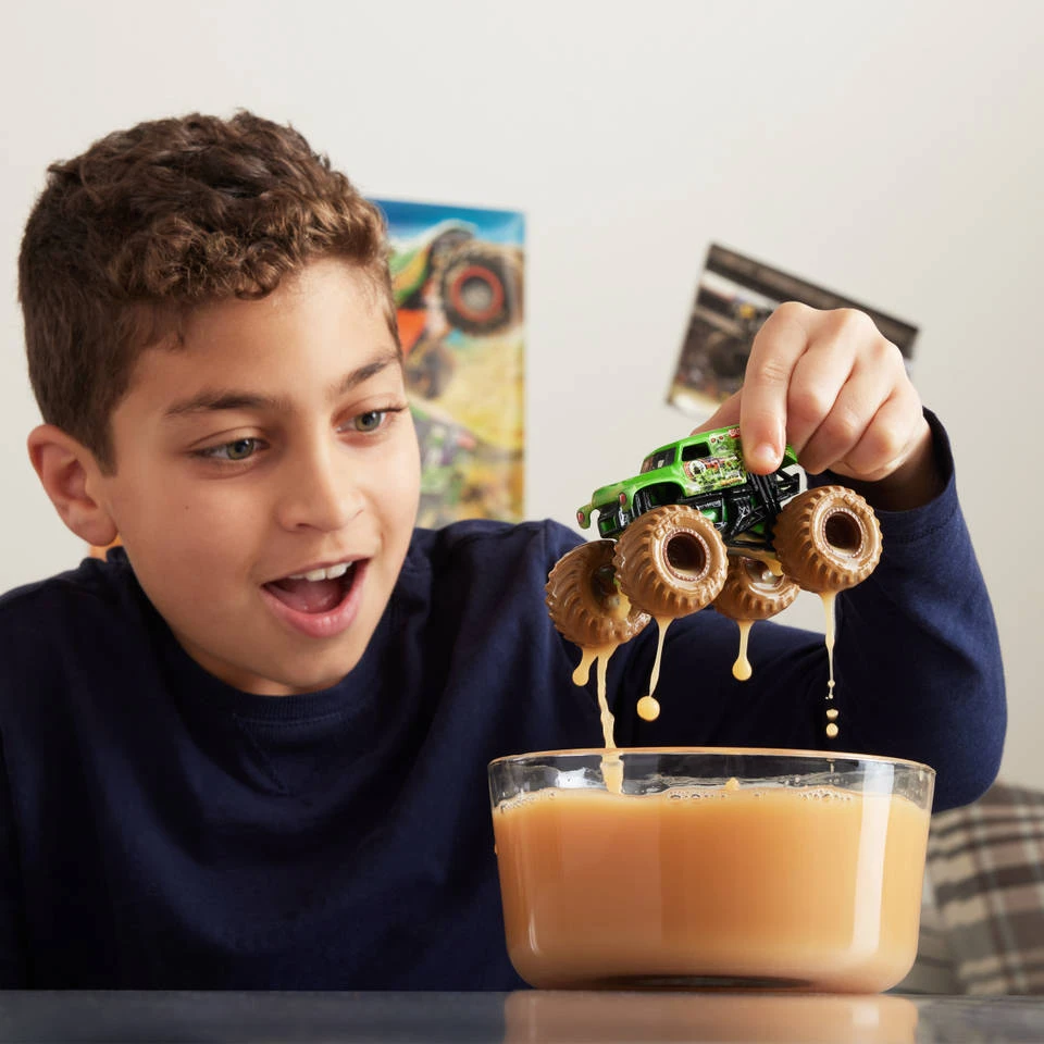 Deze Monster Jam Mystery Mudders auto laat jou de coolste stunts uithalen! Onthul bovendien unieke kleuren en versieringen door de auto in het water te leggen.